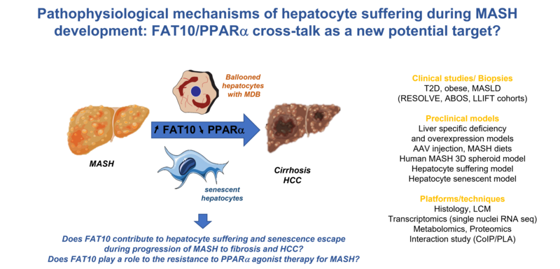 Dans ce contexte, notre groupe de recherche s’engage à comprendre en profondeur les mécanismes cellulaires et moléculaires qui sous-tendent la progression de la maladie. Nous cherchons à identifier les facteurs qui entraînent l’inflammation chronique du foie, la souffrance des cellules hépatiques et, à terme, l’apparition de complications graves. Mieux comprendre ces mécanismes est une étape indispensable pour développer des stratégies thérapeutiques adaptées. Notre équipe s’appuie sur une approche intégrée combinant plusieurs niveaux d’étude : des modèles murins afin d’examiner l’évolution de la maladie dans un organisme complet ; des analyses cellulaires et moléculaires in vitro pour décrypter finement les voies biologiques impliquées ; et des études translationnelles permettant de rapprocher nos découvertes des réalités cliniques et des besoins des patients. Grâce à cette complémentarité, nous avons récemment identifié FAT10/UBD, une protéine de la famille des ubiquitine-like, comme un acteur potentiel de la progression de la maladie. Cette découverte ouvre des perspectives prometteuses pour le développement de nouvelles cibles thérapeutiques, au moment même où la communauté médicale et scientifique cherche des solutions capables d’agir sur les formes les plus sévères de la maladie. À travers ces travaux, notre ambition est de contribuer à l’amélioration de la prise en charge des patients et de participer à l’effort collectif visant à freiner la progression de cette maladie métabolique en pleine expansion.